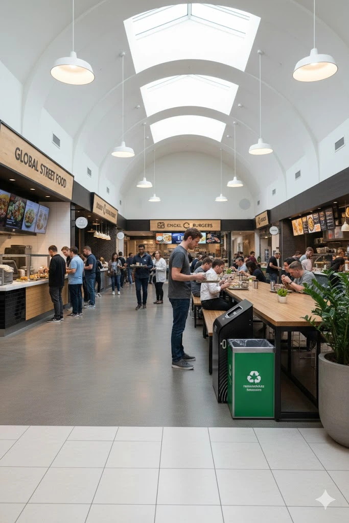 Containers move through discreet return stations and are professionally collected, sanitized, and recirculated, seamlessly integrating into high-volume cafeterias, food courts, catering, and grab-and-go programs.